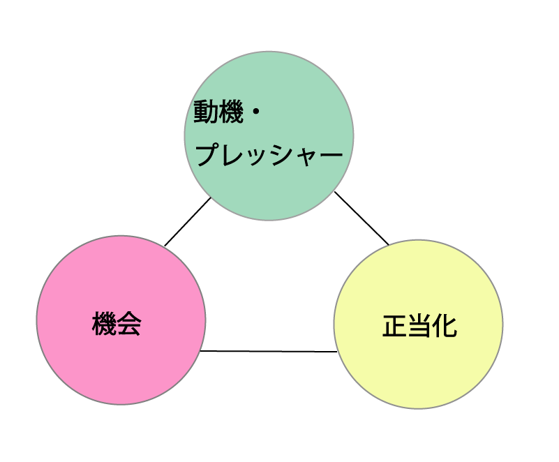 「不正のトライアングル」とは、アメリカの犯罪学者ドナルド・R・クレッシーが提唱した理論。