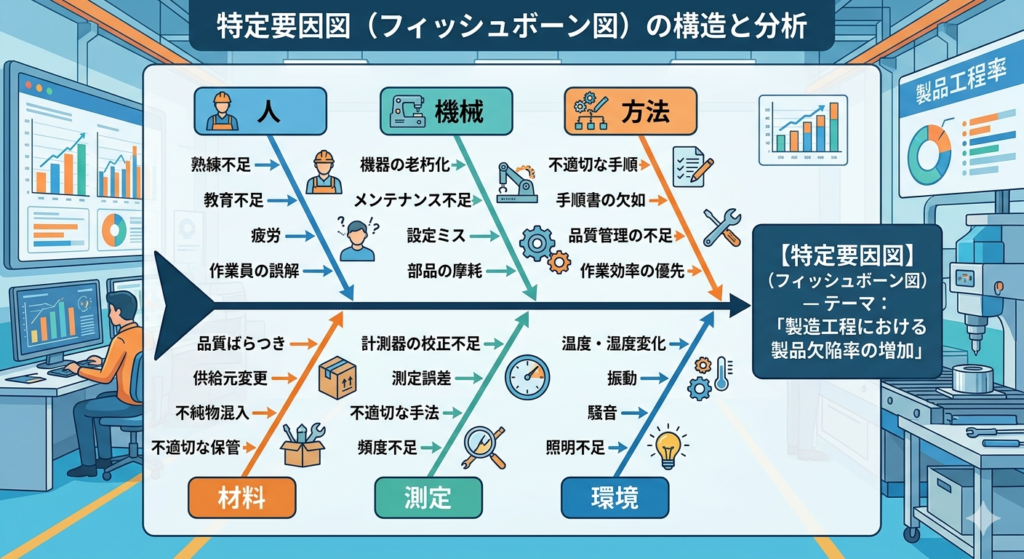 「特性(結果)」と、それに影響を及ぼす「要因(原因)」を魚の骨のような形で整理する図である。問題の真因を探るために使われる。