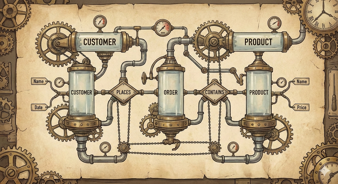 エンティティは、「社員」や「車」のような形のあるもの(物理的実体)だけでなく、「注文」「契約」「プロジェクト」といった形のない概念やイベント(概念的実体)も含む。管理する必要がある対象であれば、何でもエンティティになりうる。