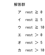 逆に、rest がマイナス(上の例の $-8$ など)になったら、それは「10円玉を使いすぎて合計金額を超えてしまった」ということなので、計算してはいけない。