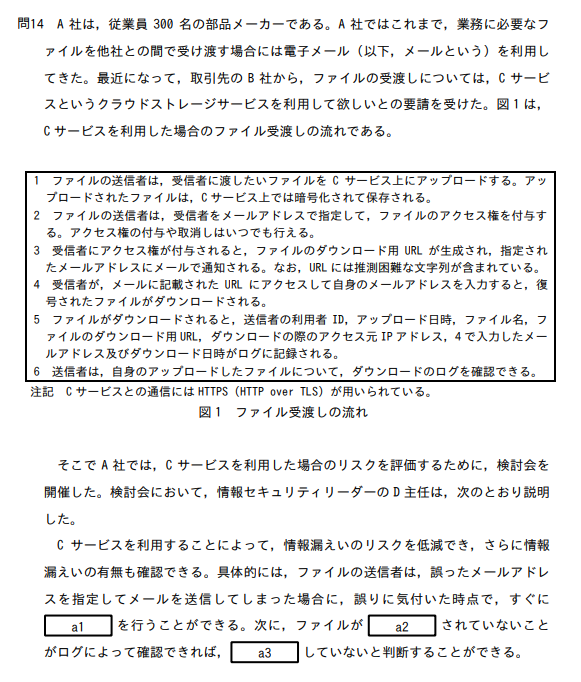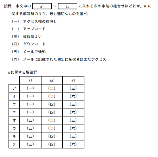 故に、a1に、「アクセス権の取消し」、a2に「ダウンロード」、a3に「情報漏えい」となる。