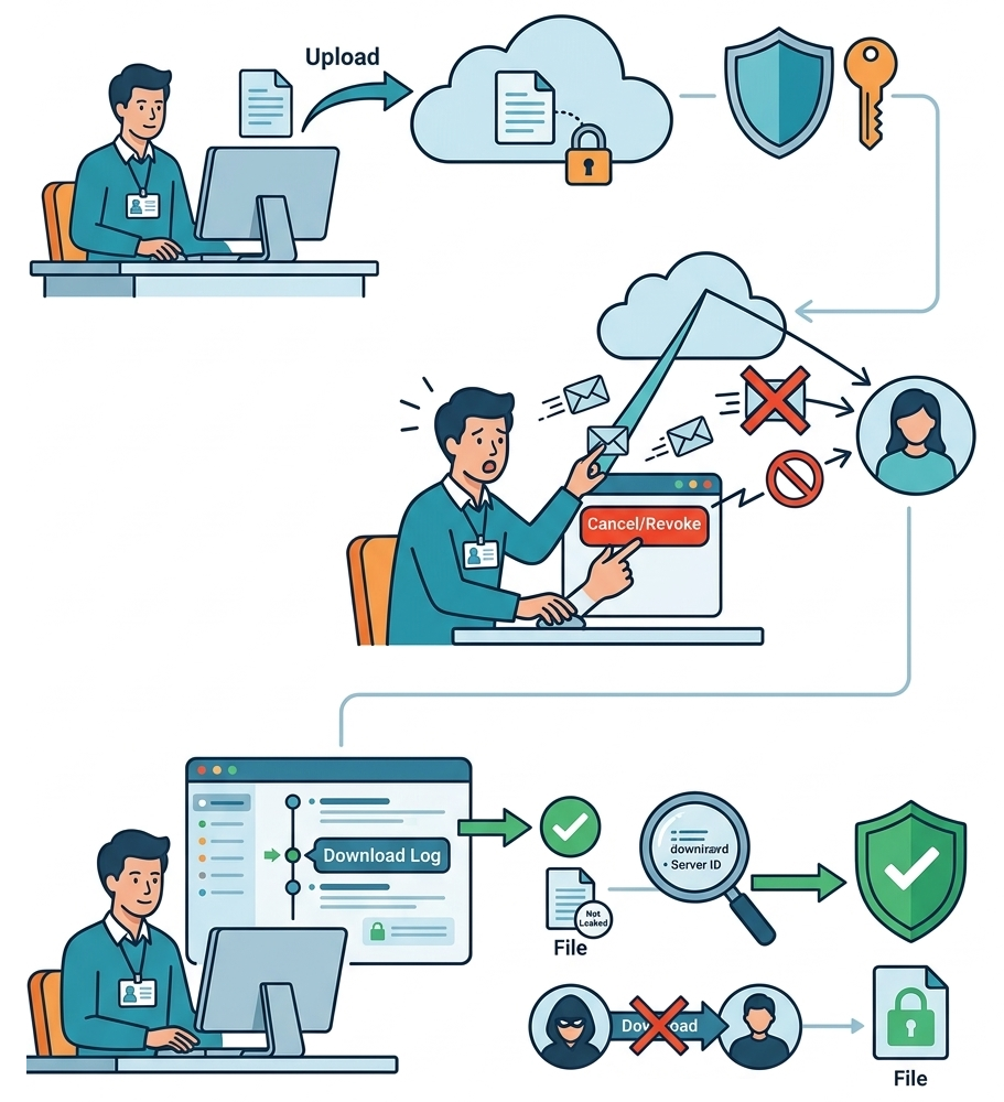 したがって、もし、誤った宛先にファイルを送ってしまっても、ファイルのアクセス権の取消しにより情報漏えいのリスクを低減できる。