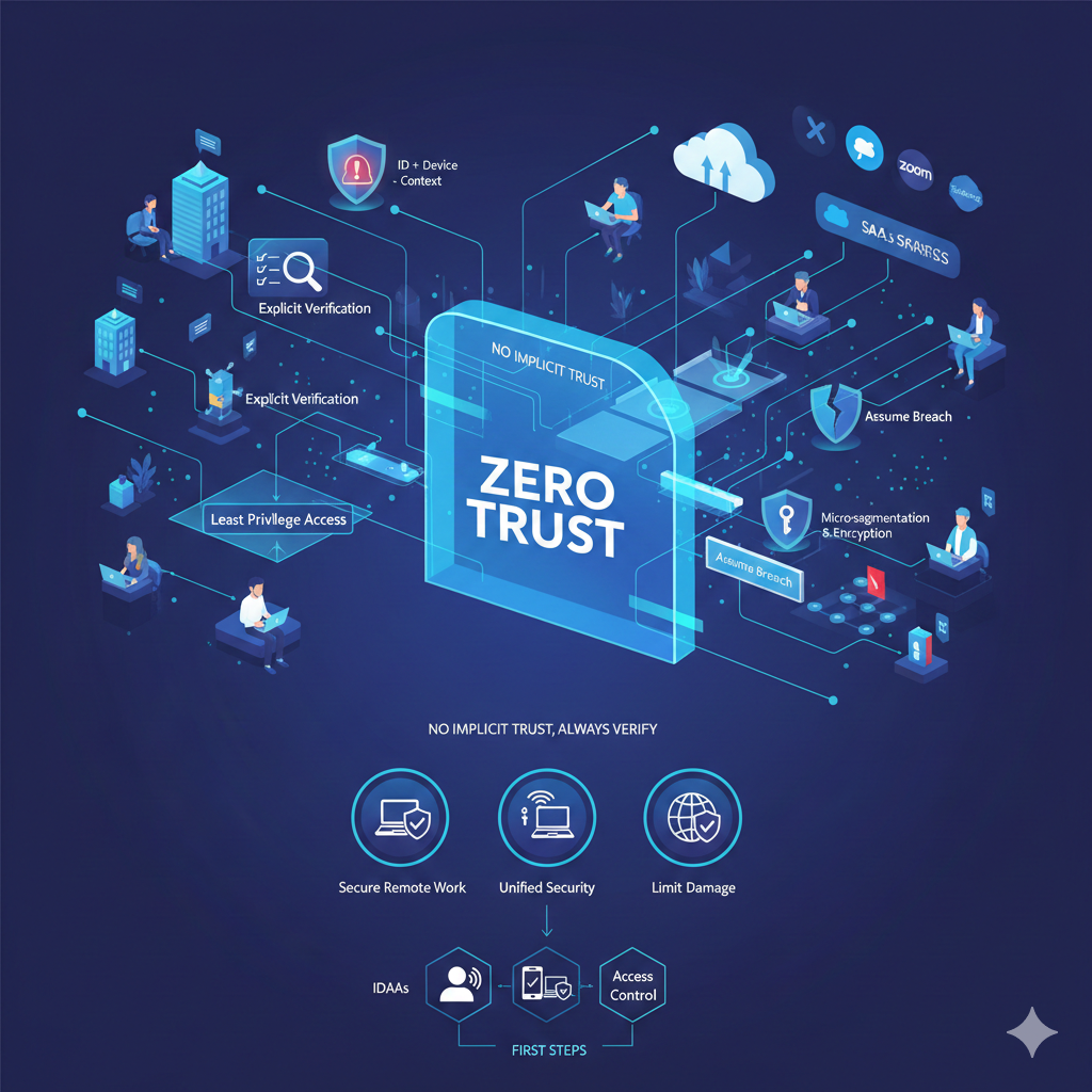 ネットワークの内部・外部を問わず、すべてのアクセスを信頼せず、利用者・端末・状況を継続的に検証してアクセスを許可するセキュリティモデルである。