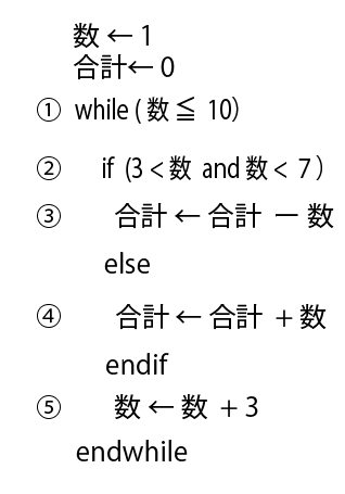 次の疑似言語プログラムを実行したとき、最終的な数の値はいくらか。